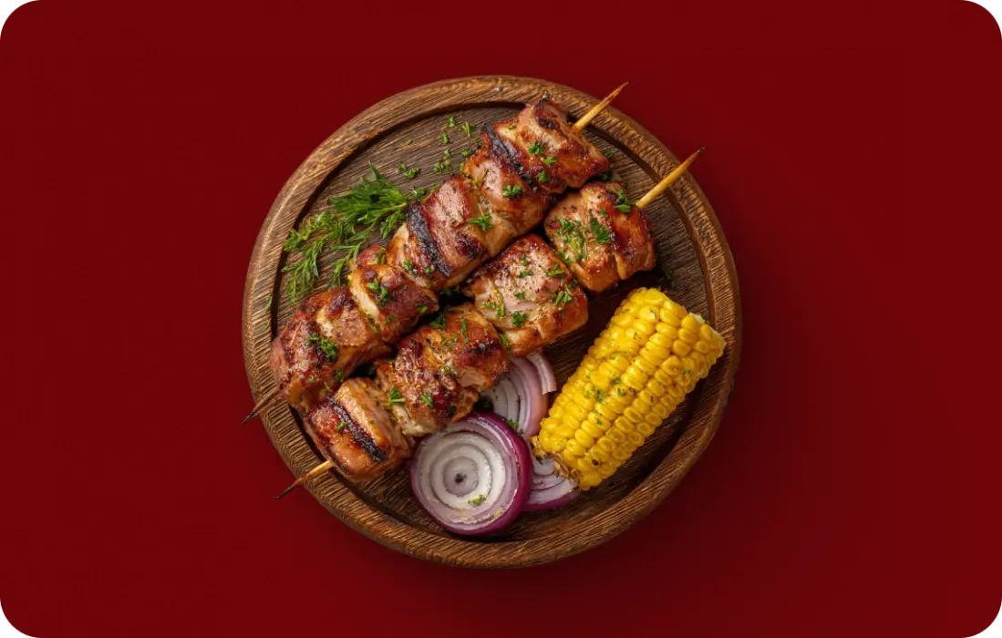 Для приготовления шашлыка свинина маринуется в смеси специй, чеснока, лимона и других натуральных ингредиентов. Это маринование способствует размягчению мяса и наделяет его богатым, ароматным вкусом. После маринования мясо жарится на углях, что придаёт ему дымный аромат и золотистую корочку.