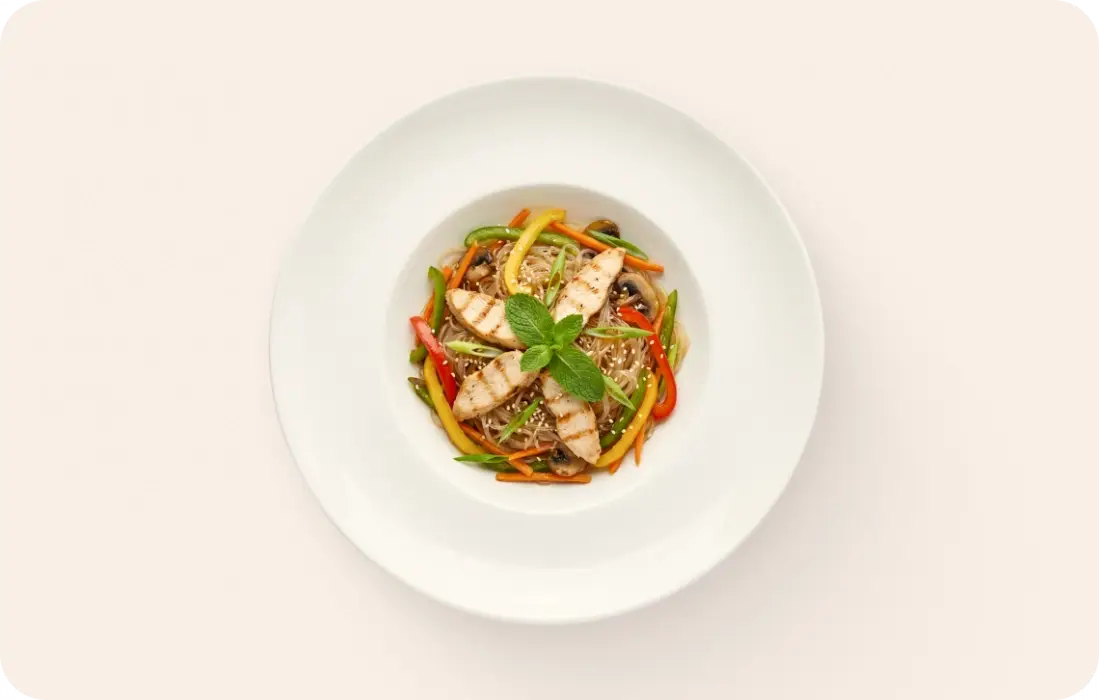 В этом блюде нежная курица, обжаренная с луком, встречается с хрустящими овощами: морковью, болгарским перцем и стручковой фасолью. А заправка из соевого соуса и рисового уксуса пропитывает каждый ингредиент, создавая глубокие вкус и аромат.
