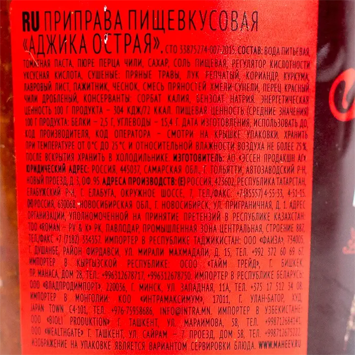 вода,томатная паста, пюре перца чили, сахар, соль пищевая, регулятор кислотности уксусная кислота,сушеные: пряные травы, лук репчатый, кориандр, куркума, лавровый лист, пажитник, чеснок, смесь прянностей хмели-сунели,перец красный чили дробленый, консерванты: сорбат калия,бензоат натрия.