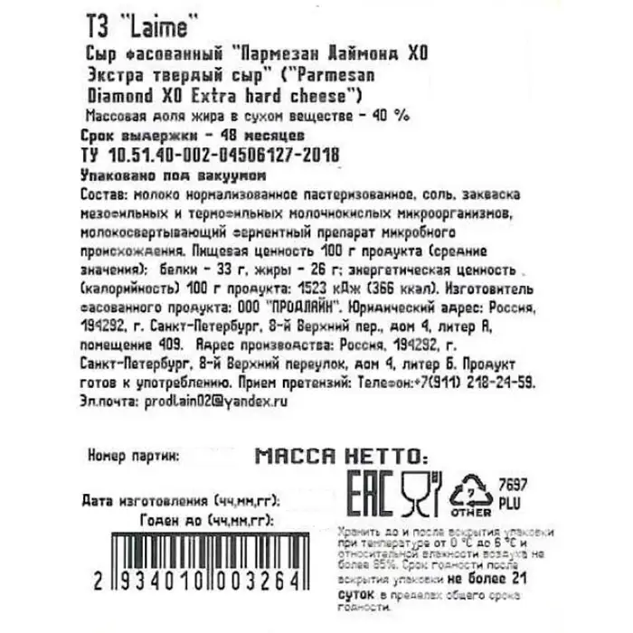 Сыр твердый Пармезан Даймонд ХО Экстра жир. 40% сегмент, выд. 48 мес. ~500 гр*8 (Молочная Мастерская, Россия)