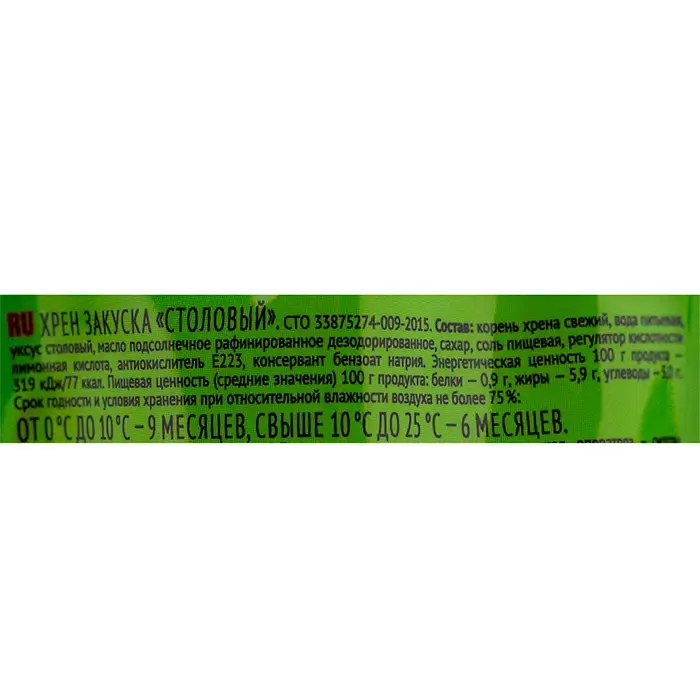 корень хрена свежий, вода питьевая, уксус столовый, масло подсолнечное рафинированное дезодорированное, сахар, соль пищевая, регулятор кислотности лимонная кислота, антиокислитель Е223, консервант бензоат натрия.