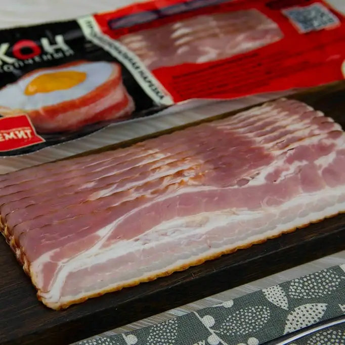 Свиной сырокопченый бекон, нарезанный на тонкие слайсы. У бекона нежная, упругая текстура и аромат копчения и пряностей.