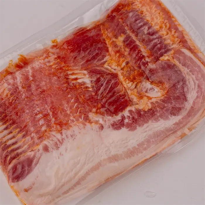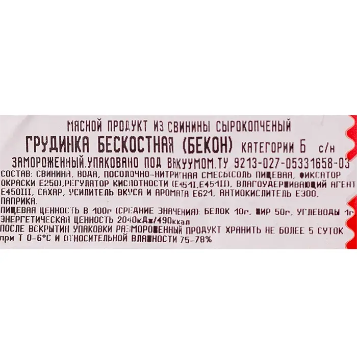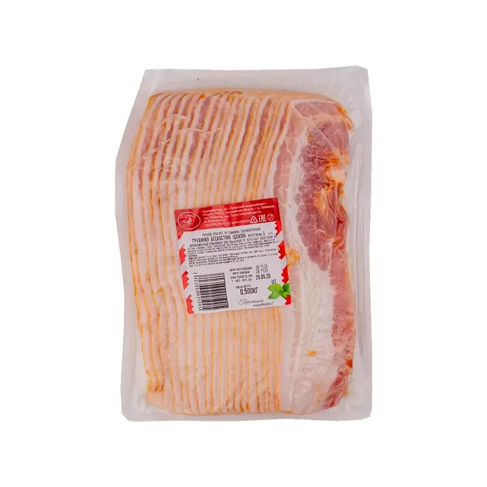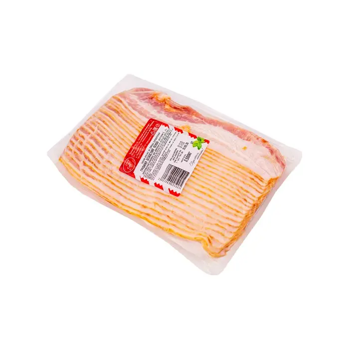 Тонкие ломтики бекона готовы к использованию, изготовлены из отборной свиной грудинки. Мясо сначала отваривают, затем коптят. Бекон имеет упругую, сочную текстуру, нежный соленый вкус с копчеными нотами и пряный аромат.