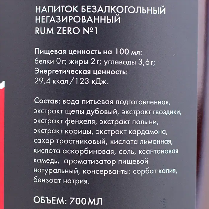 "Вода питьевая подготовленная, экстракт щепы дубовый, экстракт гвоздики, экстракт фенхеля, экстракт полыни, экстракт корицы, экстракт кардамона, сахар тростниковый, кислота лимонная, кислота аскорбиновая, соль, ксантановая камедь, ароматизатор пищевой натуральный. Консерванты: сорбат калия, бензоат натрия