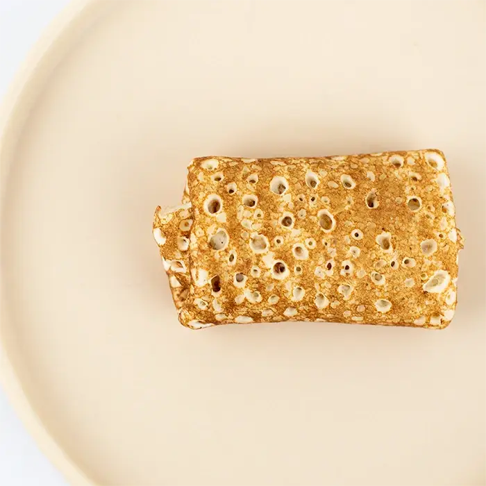Блины с рубленой ветчиной и сыром имеют светло-золотистый цвет, сливочный аромат, плотную эластичную консистенцию снаружи и упругую, кремово-тягучую текстуру внутри. Сладковатое тесто блина сочетается с солоноватой начинкой, у блинов насыщенный мясной вкус с нежными сливочными нотами.