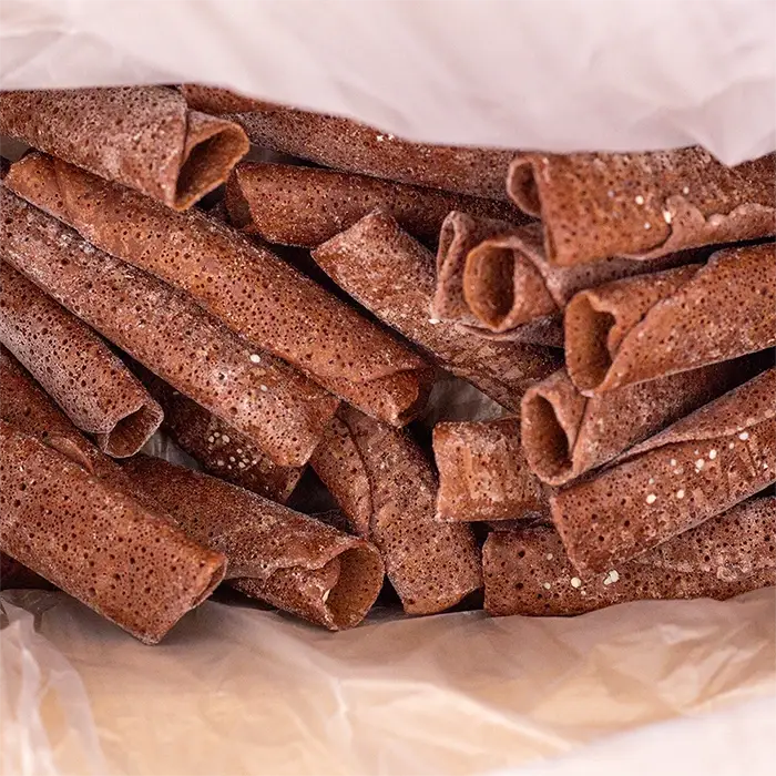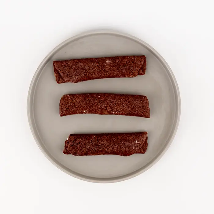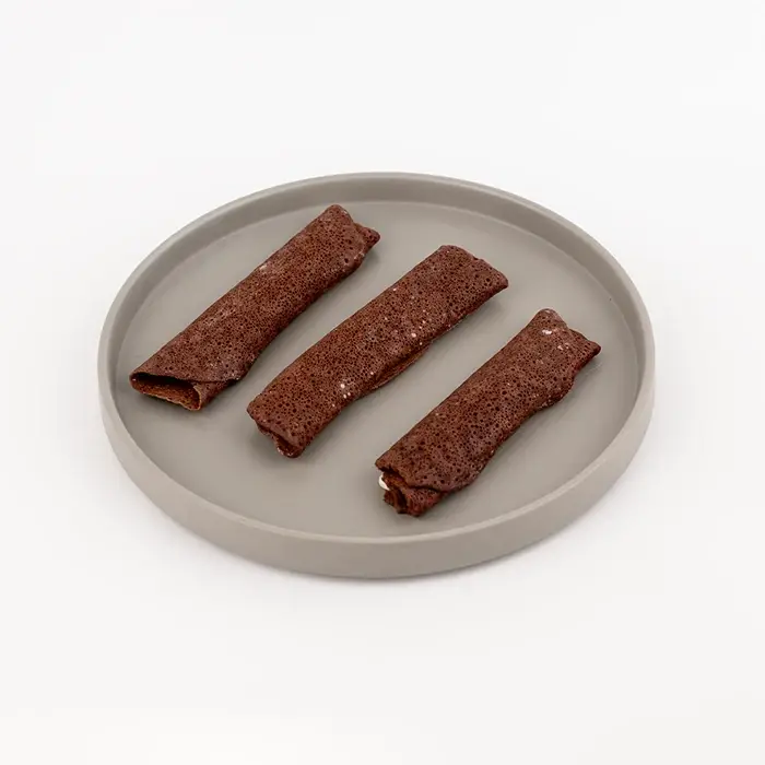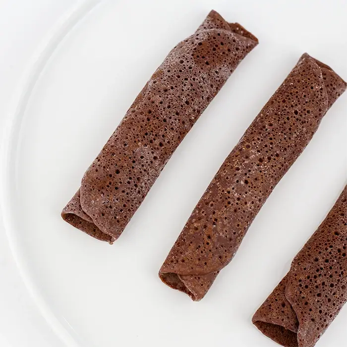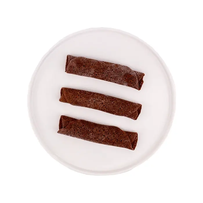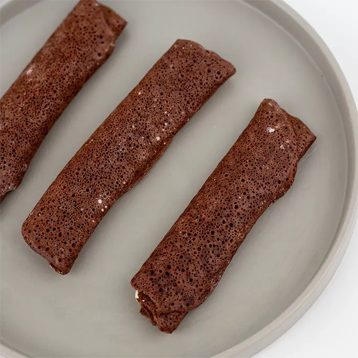 Тонкие шоколадные блины имеют пористую текстуру, насыщенный вкус какао, белый шоколад добавляет сладость и сливочные ноты.