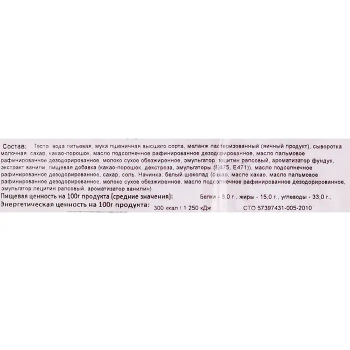 Тесто: вода питьевая, мука пшеничная высшего сорта, меланж пастеризованный (яичный продукт), сыворотка молочная, сахар, какао-порошок, масло подсолнечное рафинированное дезодорированное, масло пальмовое рафинированное дезодорированное, молоко сухое обезжиренное, эмульгатор лецитин рапсовый, ароматизатор фундук, экстракт ванили, пищевая добавка (какао-порошок, декстроза, эмульгаторы (Е475, Е471)), масло подсолнечное рафинированное дезодорированное, сахар, соль. Начинка: белый шоколад (сахар, масло какао, масло пальмовое рафинированное дезодорированное, молоко сухое обезжиренное, масло подсолнечное рафинированное дезодорированное, эмульгатор лецитин рапсовый, ароматизатор ванилин).