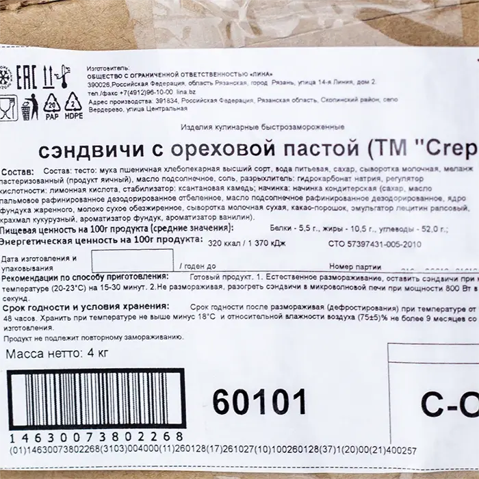 тесто: мука пшеничная хлебопекарная высший сорт, вода питьевая, сахар, сыворотка молочная, меланж пастеризованный (продукт яичный), масло подсолнечное, соль, разрыхлитель: гидрокарбонат натрия, регулятор кислотности: лимонная кислота, стабилизатор: ксантановая камедь; начинка: начинка кондитерская (сахар, масло пальмовое рафинированное дезодорированное отбеленное, масло подсолнечное рафинированное дезодорированное, ядро фундука жаренного, молоко сухое обезжиренное, сыворотка молочная сухая, какао-порошок, эмульгатор лецитин рапсовый, крахмал кукурузный, ароматизатор фундук, ароматизатор ванилин).