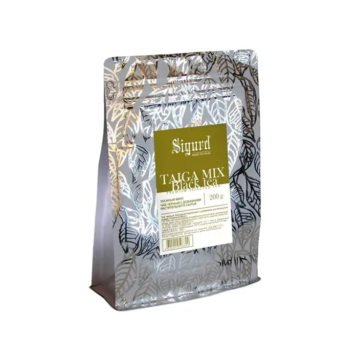 Крупнолистовой индийский рассыпной чай с натуральными добавками растений и ягод из тайги имеет терпкий мятно-пряный вкус, свежий аромат луговых трав.