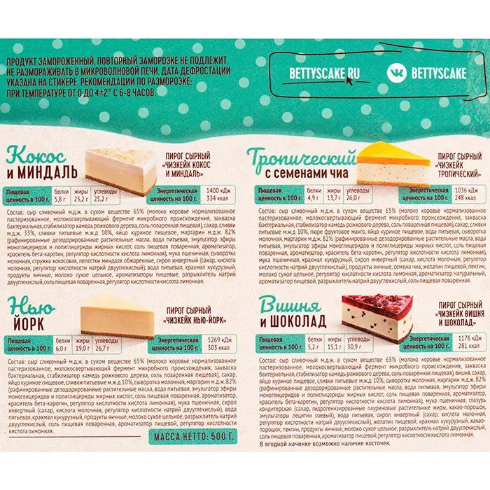 «Нью-йорк»: сыр сливочный мдж. в сухом веществе 65% (молоко коровье нормализованное пастеризованное, молокосвертывающий фермент микробного происхождения, закваска бактериальная, стабилизатор камедь рожкового дерева, соль поваренная пищевая), сахар, сливки питьевые мжд 10%, пюре фруктовое манго, яйцо куриное пищевое, вода питьевая, сыворотка молочная, маргарин м.д ж 82% (рафинированные дезодорированные растительные масла, вода питьевая, эмульгатор эфиры моноглицеридов и полиглицериды жирных кислот, соль пищевая поваренная, ароматизатор, краситель бета-каротин, регулятор кислотности кислота лимонная), мука пшеничная, крахмал кукурузный, сирол инвертный (сахар, кислота молочная, регулятор кислотности натрий двууглекислый), продукты яичные, семена чиа, желатин пищевой, пектин, молоко сухое цельное, регулятор кислотности кислота лимонная, ароматизатор натуральный, ароматизатор пищевой, разрыхлитель натрий двууглекислый, соль пищевая поваренная.