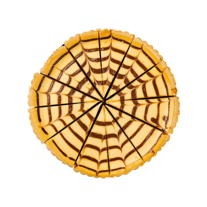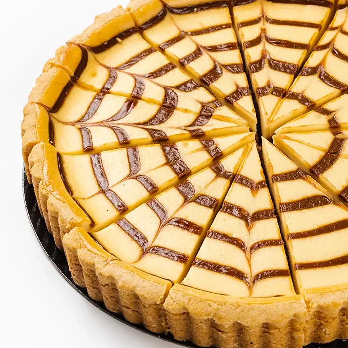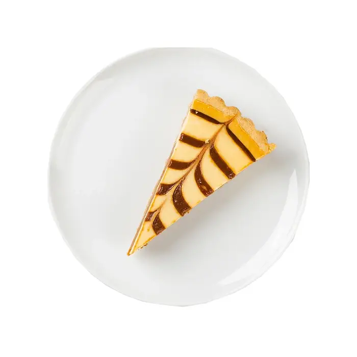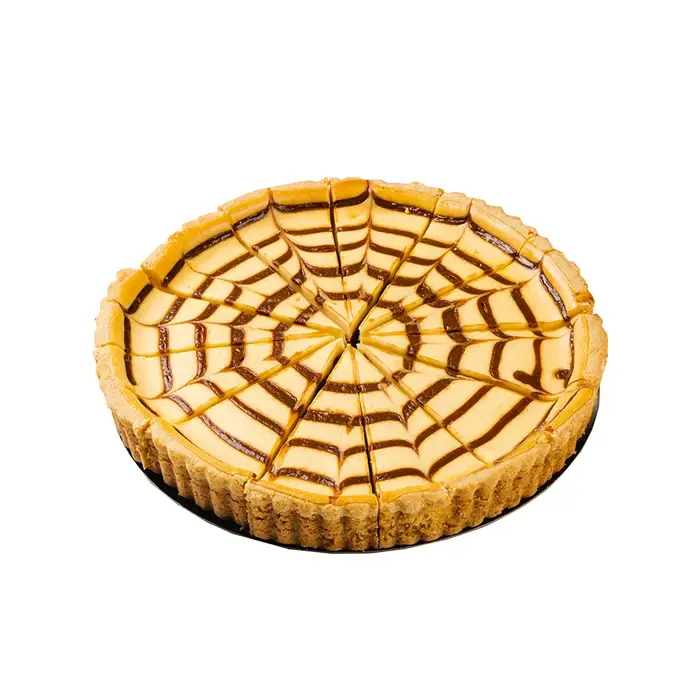 Десерт со сладковатым молочным вкусом на нежной карамельно-песочной основе с начинкой из сливочного сыра и карамельной прослойки, покрыт «мраморной» глазурью из карамели. Чизкейк готов к употреблению после разморозки.