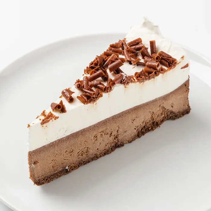 Классический чизкейк с ярким шоколадным вкусом изготовлен из натурального сливочного сыра. Воздушный слой мусса из натуральных сливок и хрустящая стружка молочного шоколада придают десерту аппетитный эффектный вид. Чизкейк уже аккуратно рарезан на порции — каждый кусок отделен бумажной прослойкой для вашего удобства.