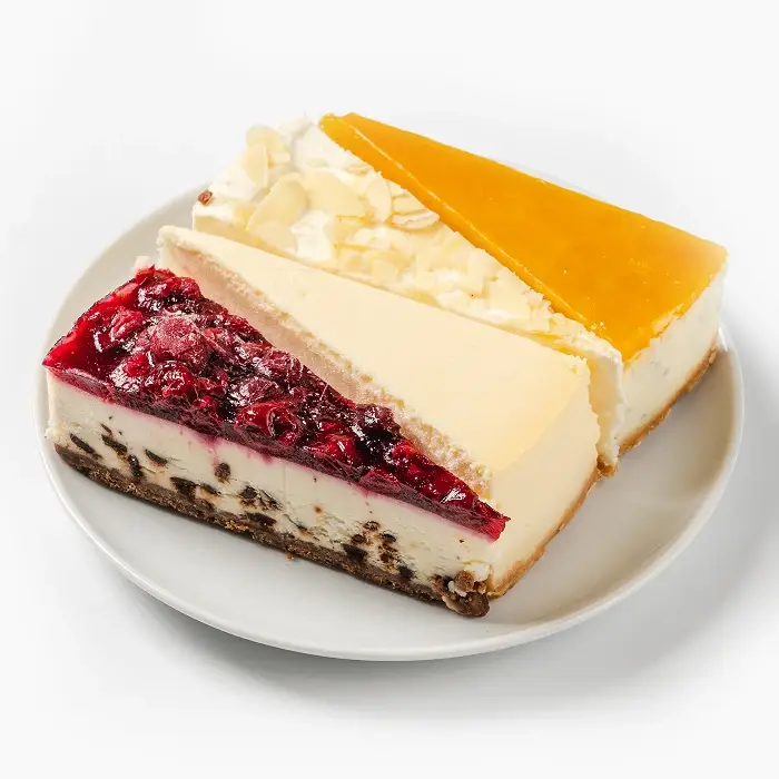 Каждый кусок имеет порционную форму. Основа чизкейка — хрустящая, рассыпчатая крошка из сахарного печенья, сырная масса имеет сливочный вкус и густую, кремовую консистенцию. В зависимости от вкуса, встречаются видимые добавки: ягоды, орехи, шоколад, желе из фруктов, семена чиа.