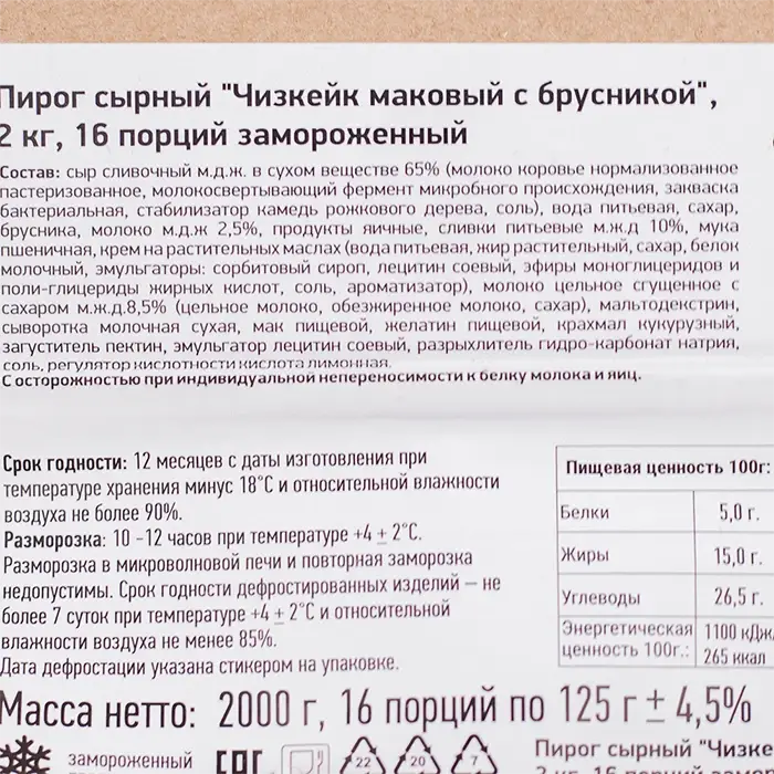 Сыр сливочный м.д.ж в сухом веществе 65% (молоко коровье нормализованное пастеризованное, молокосвертывающий фермент микробного происхождения, закваска бактериальная, стабилизатор – камедь рожкового дерева, соль поваренная пищевая), сахар, брусника, молоко м.д.ж 2,5%, яйцо куриное пищевое, маргарин м.д.ж 82% (рафинированные дезодорированные растительные масла, вода питьевая, эмульгатор эфиры моноглицеридов и полиглицериды жирных кислот, соль пищевая поваренная, ароматизатор, краситель – бета-каротин, регулятор кислотности – кислота лимонная, сливки питьевые м.ж.д 10%, крем на растительных маслах (вода питьевая, жир растительный, сахар, белок молочный, эмульгаторы (сорбитовый сироп, лецитин соевый, эфиры глицерина, цитрат магния), мука пшеничная, вода питьевая, молоко цельное сгущенное с сахаром м.ж.д 8,5% (цельное молоко, обезжиренное молоко, сахар), мальтодекстрин, сыворотка молочная, мак пищевой, сироп инвертный (сахар, кислота молочная, регулятор кислотности – натрий двууглекислый), желатин пищевой, крахмал кукурузный, продукты яичные, пектин, молоко сухое цельное, разрыхлитель – натрий двууглекислый, соль пищевая поваренная, ароматизатор пищевой, регулятор кислотности – кислота лимонная.