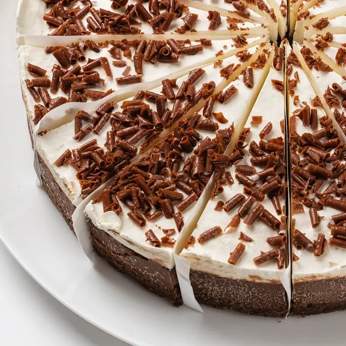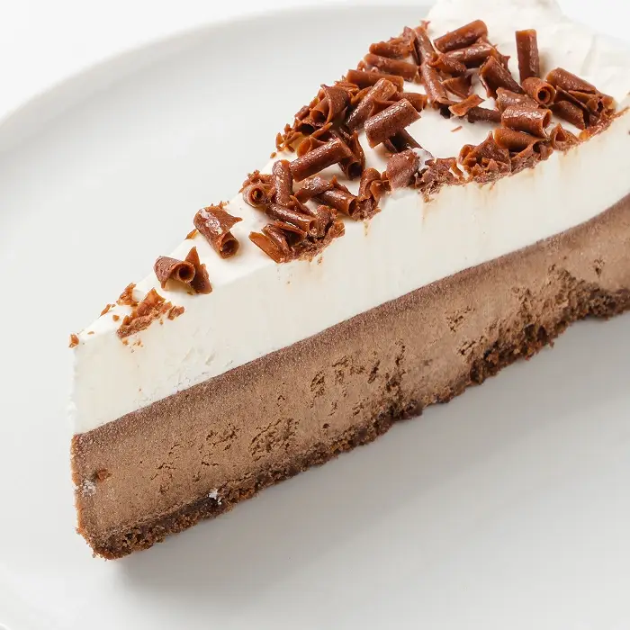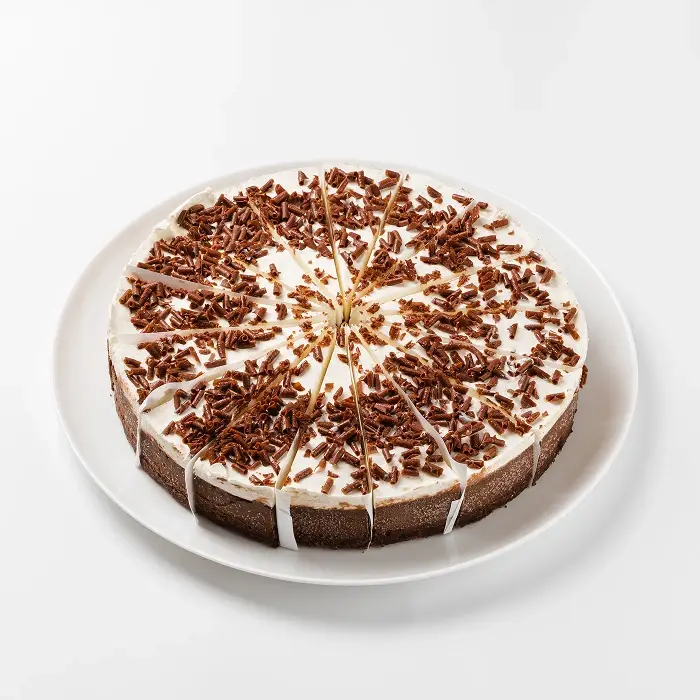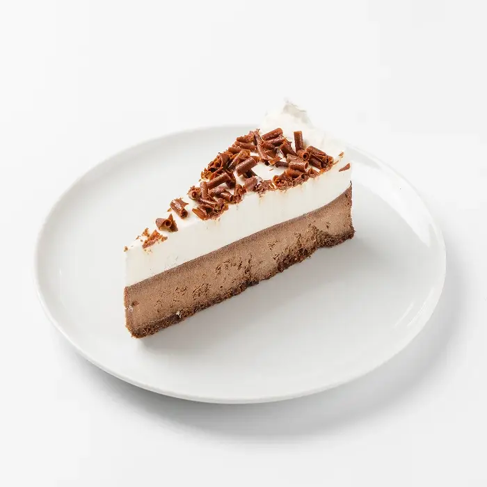 Классический чизкейк с ярким шоколадным вкусом изготовлен из натурального сливочного сыра. Воздушный слой мусса из натуральных сливок и хрустящая стружка молочного шоколада придают десерту аппетитный эффектный вид. Чизкейк уже аккуратно рарезан на порции — каждый кусок отделен бумажной прослойкой для вашего удобства.
