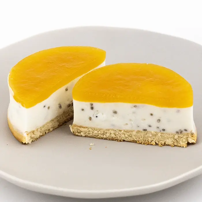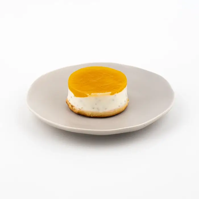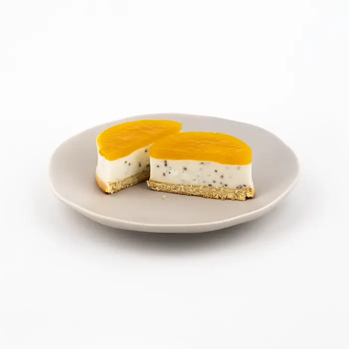 Мини-чизкейк состоит из нежной сырной массы на основе из рассыпчатого сахарного печенья, верхний слой содержит прослойку из мангового пюре. Чизкейк имеет сливочный вкус с легкой кислинкой, фруктовый аромат, кремовую, нежную текстуру.