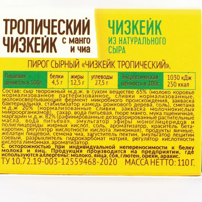 Сыр сливочный м.д.ж. в сухом веществе 65% (молоко коровье нормализованное пастеризованное, молокосвертывающий фермент микробного происхождения, закваска бактериальная, стабилизатор камедь рожкового дерева, соль поваренная пищевая), сахар, сливки питьевые м.ж.д 10%, пюре фруктовое манго, яйцо куриное пищевое, вода питьевая, сыворотка молочная, маргарин м.д.ж. 82% (рафинированные дезодорированные растительные масла, вода питьевая, эмульгатор эфиры моноглицеридов и полиглицериды жирных кислот, соль пищевая поваренная, ароматизатор, краситель бета-каротин, регулятор кислотности кислота лимонная), мука пшеничная, крахмал кукурузный, сироп инвертный (сахар, кислота молочная, регулятор кислотности натрий двууглевислый), продукты яичные, молоко сухое цельное, регулятор кислотности кислота лимонная. ароматизатор натуральный, ароматизатор пищевой, разрыхлитель натрий двууглекислый, краситель пищевой, соль пищевая поваренная.