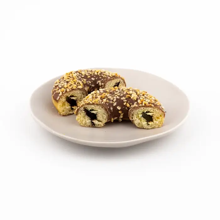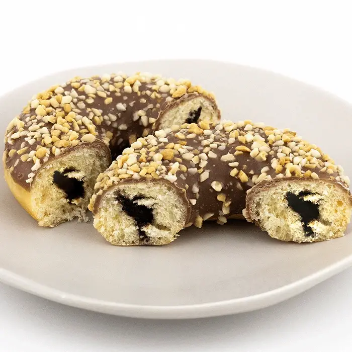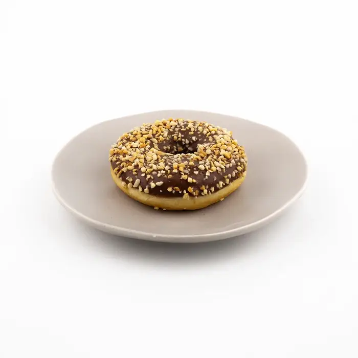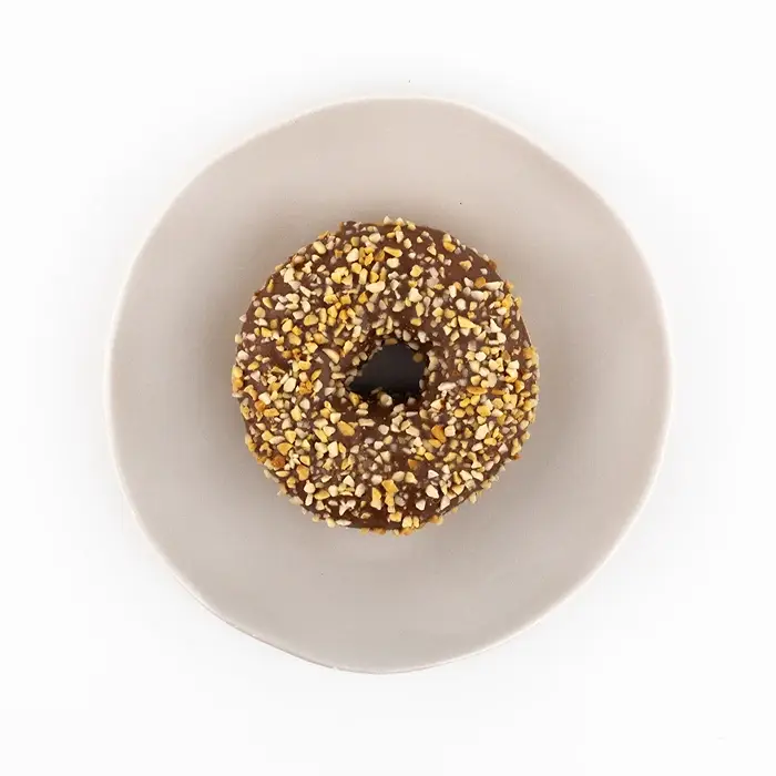 Воздушное дрожжевое тесто обжаривается до равномерной золотистой корочки и наполняется густой начинкой из фундука, сверху покрыто шоколадной глазурью с посыпкой из дробленого арахиса. Донат имеет круглую форму, мягкую с легкой упругостью текстуру, сладкий ореховый вкус и аромат свежей выпечки.