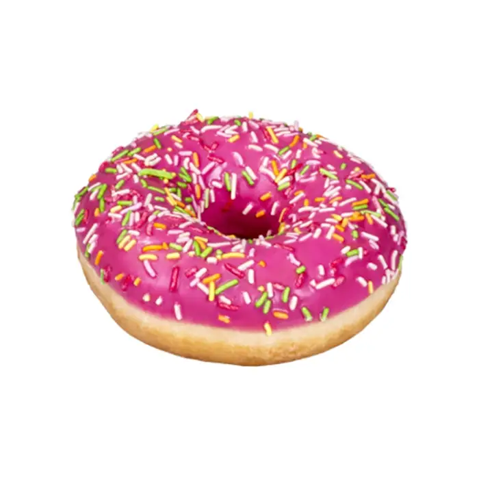 Пончик с клубничной начинкой украшен розовой глазурью и разноцветной посыпкой, имеет мягкую сочную текстуру.