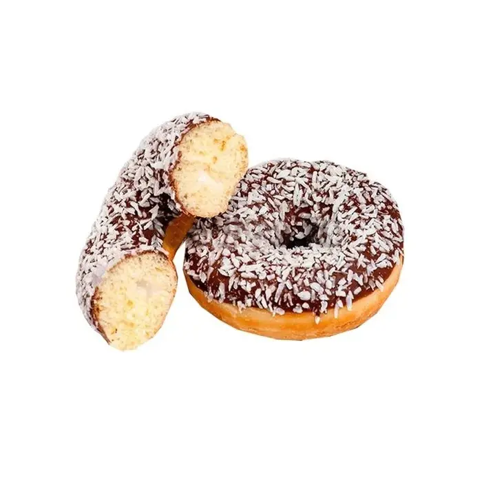 Пончик с нежной кокосовой начинкой, шоколадной глазурью с посыпкой из кокосовой стружки.