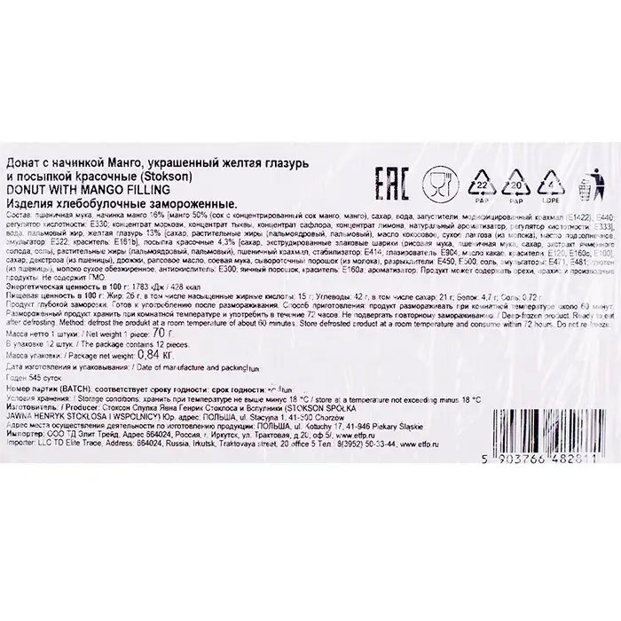 Донат с начинкой манго "Stokson", 36 шт по 70 гр