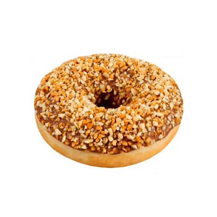 Пончик с ореховой начинкой украшен ореховой глазурью и кусочками арахиса, имеет мягкую сочную текстуру.