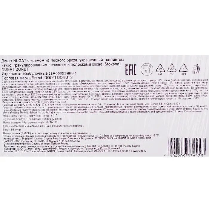 Донат с ореховым кремом, глазурью и посыпкой из печенья Nugat “Stokson”, 36 шт по 71 гр