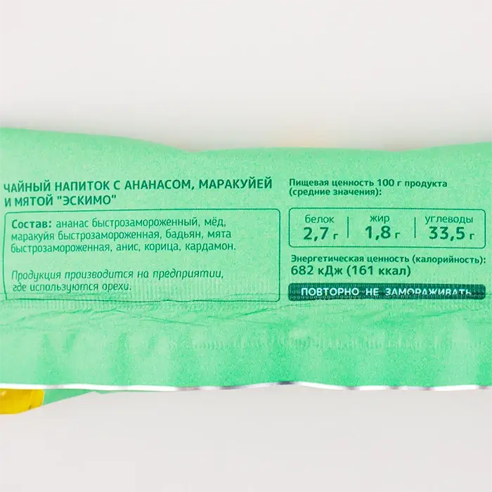 Чайный напиток в виде эскимо для быстрого заваривания состоит из замороженных ананасов, маракуйи, меда, бадьяна, мяты, аниса, корицы и кардамона. Напиток имеет сладко-кислый вкус с освежающим мятным послевкусием, пряный аромат, светло-желтый цвет, слегка густую текстуру с кусочками фруктов.