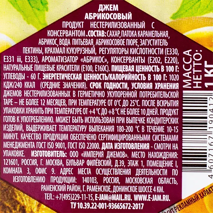 Абрикос, сахар, глюкозно-фруктовый сироп, загуститель пектин, регулятор кислотности лимонная кислота, консервант сорбат калия, вода.