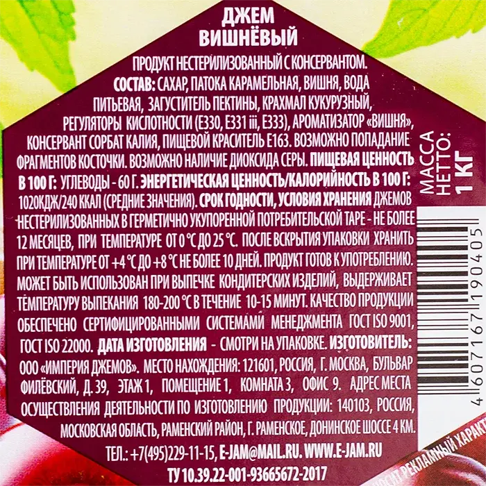 Ягода вишня, сахар, глюкозно-фруктовый сироп, загуститель пектин, регулятор кислотности лимонная кислота, консервант сорбат калия, вода.