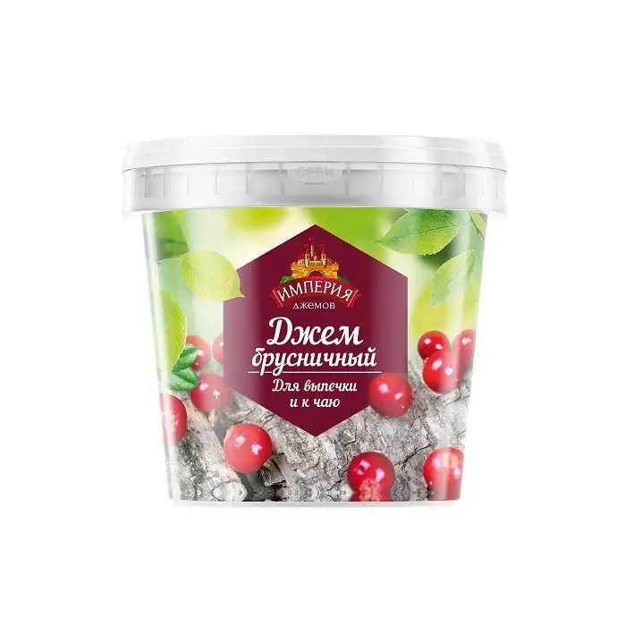 Ягода брусника, сахар, глюкозно-фруктовый сироп, загуститель пектин, регулятор кислотности лимонная кислота, консервант сорбат калия, вода.