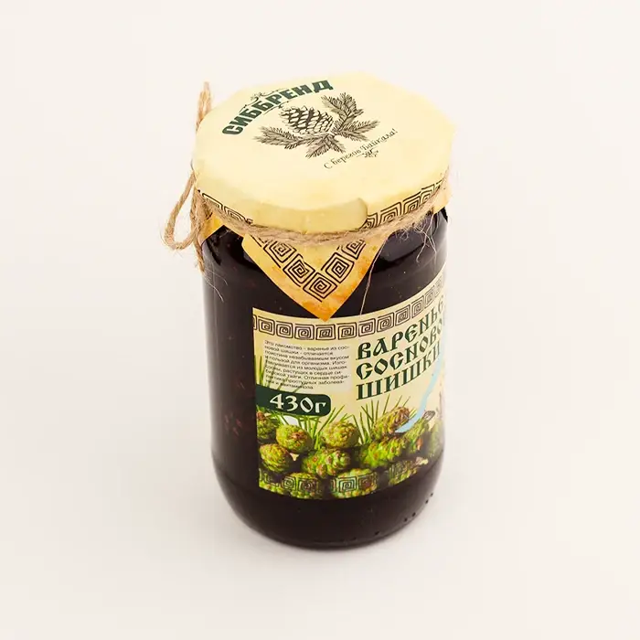 Сладкое варенье из сосновых шишек имеет смолянистый вкус с легкой горчинкой, хвойный аромат, янтарный цвет, содержит съедобные молодые зеленые шишечки.