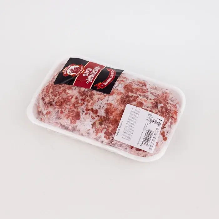 Домашний фарш изготовлен из равных долей свинины и говядины (50 / 50). Фарш имеет насыщенный мясной вкус со сладковатыми нотами, однородную, нежную, умеренно влажную консистенцию без лишней жирности или водянистости.