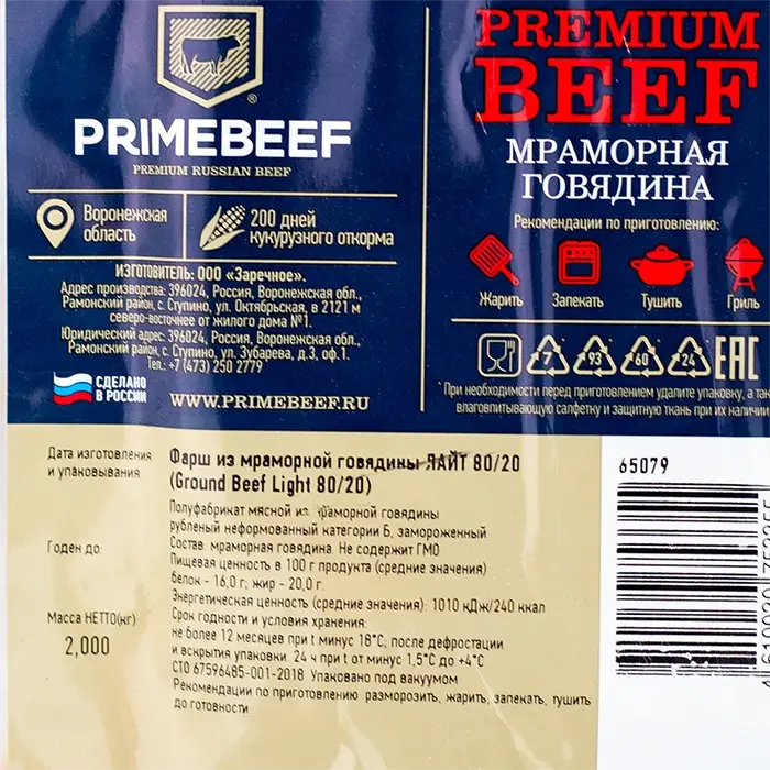 Говядина, фарш 80/20 Angus Ground Beef Light «Праймбиф», 2 кг