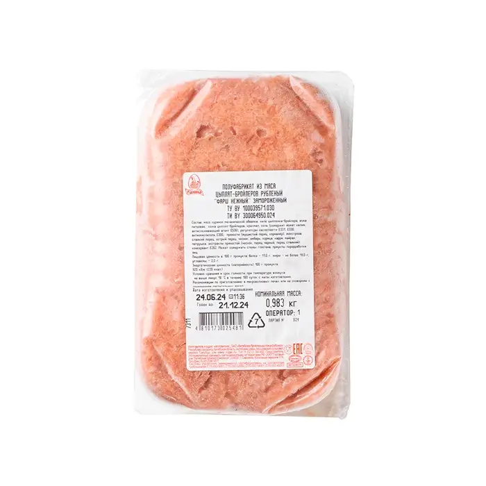 Рубленый куриный фарш имеет нежную и сочную консистенцию, тонкий аромат, насыщенный вкус. Глубокая заморозка продукта сохраняет первоначальный вид, вкус, сочность за счет быстрого охлаждения без образования льда. Вакуумная упаковка защищает продукт от влаги, внешних воздействий и воздуха, что позволяет продлить срок его хранения.