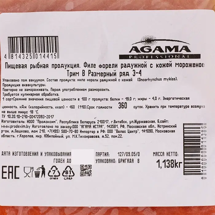 Филе форели радужной с кожей (Oncorhynchua mykiss)