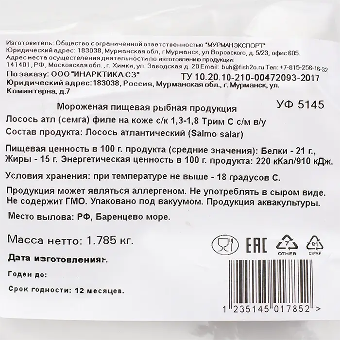 Филе лосося атлантического (семги) свежемороженое на коже с костями трим С Inarctica, 1,3-1,8 кг
