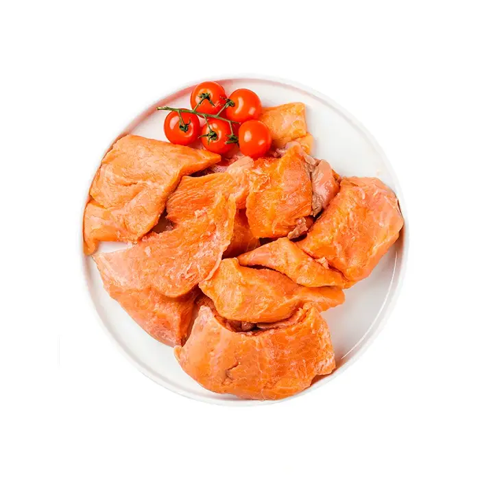Куски разных размеров свежемороженого филе семги без кожи имеют плотную и нежную текстуру, насыщенный вкус. Почти 30% от всего объема кусочков — брюшки и полоски. Шоковая заморозка позволяет сохранить вкусовые и питательные свойства продукта, при этом льда на нем практически нет.