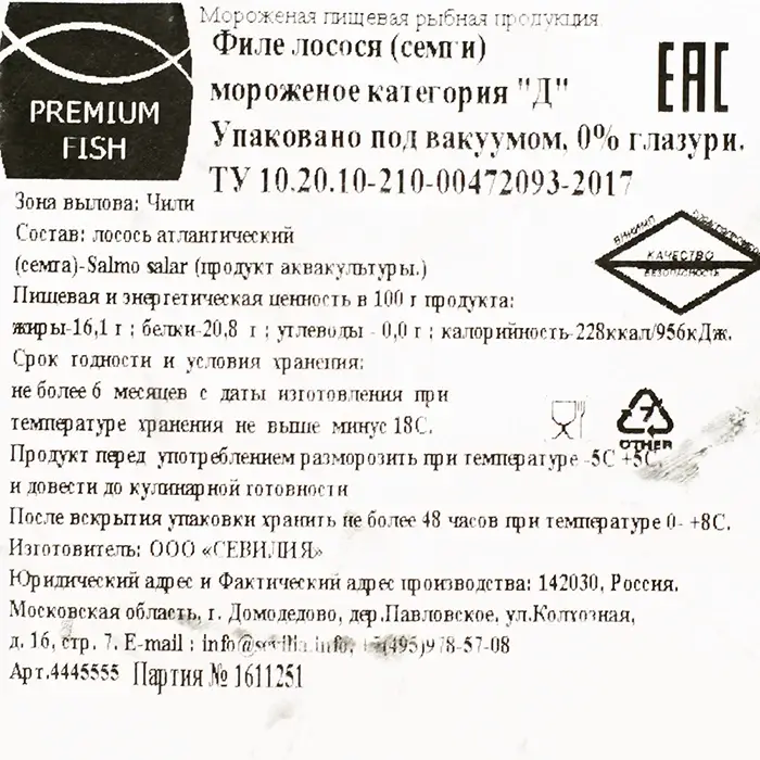 Филе лосося, вода (защитная ледяная оболочка).