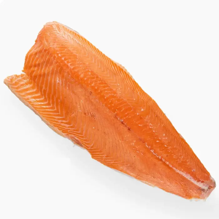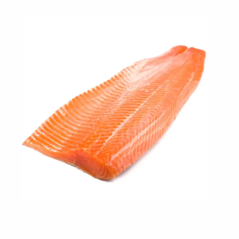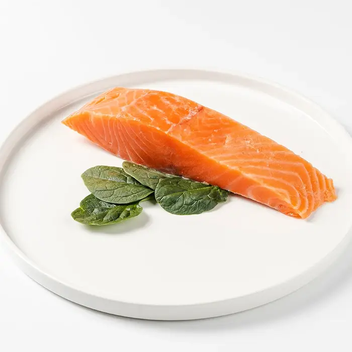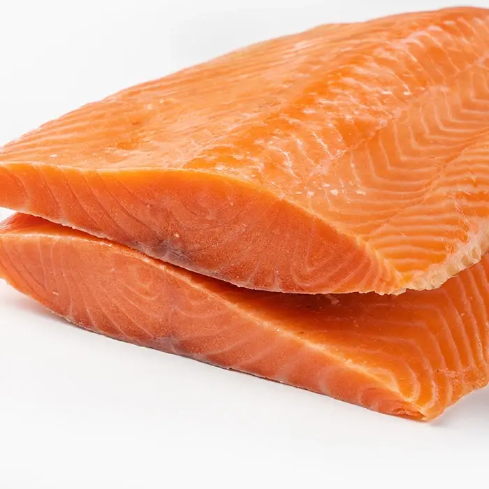 Свежемороженое филе семги на коже имеет легкий аромат, сладковатый вкус и упругую текстуру с жировыми прослойками, которые придают рыбе нежность и сочность во время приготовления.