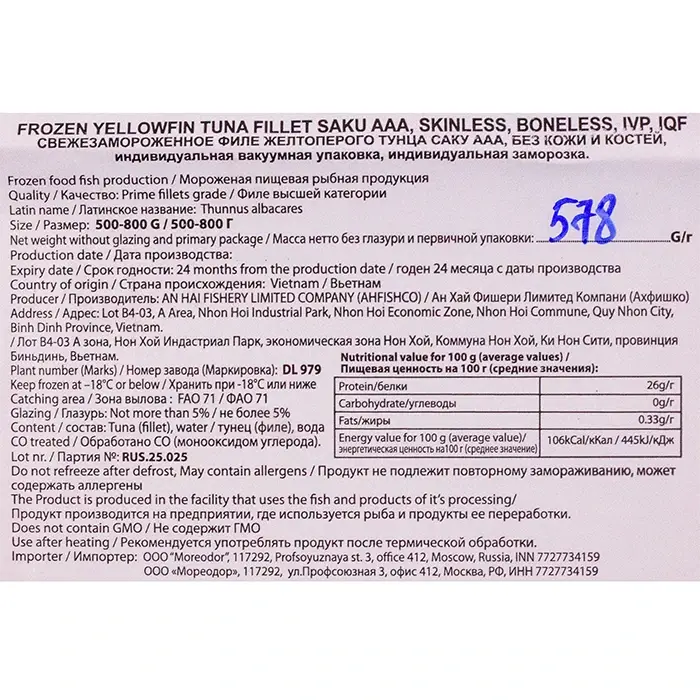 Свежемороженое филе тунца имеет плотное, нежное и бескостное мясо, слоистую текстуру.
