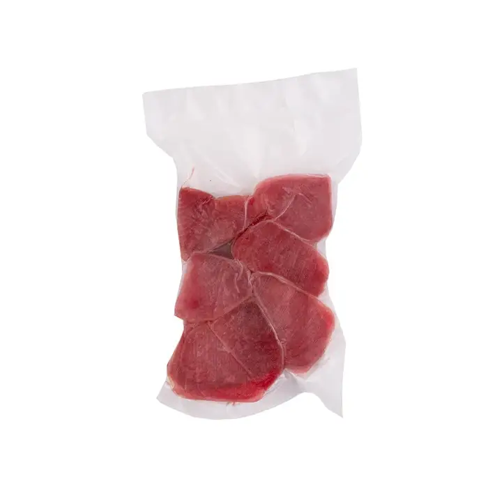 Свежемороженое филе тунца нарезано и заморожено кусочками. Тунец называют «морской телятиной» за нежный мясной вкус с легкой кислинкой, насыщенный красный цвет и плотную, упругую текстуру мяса.