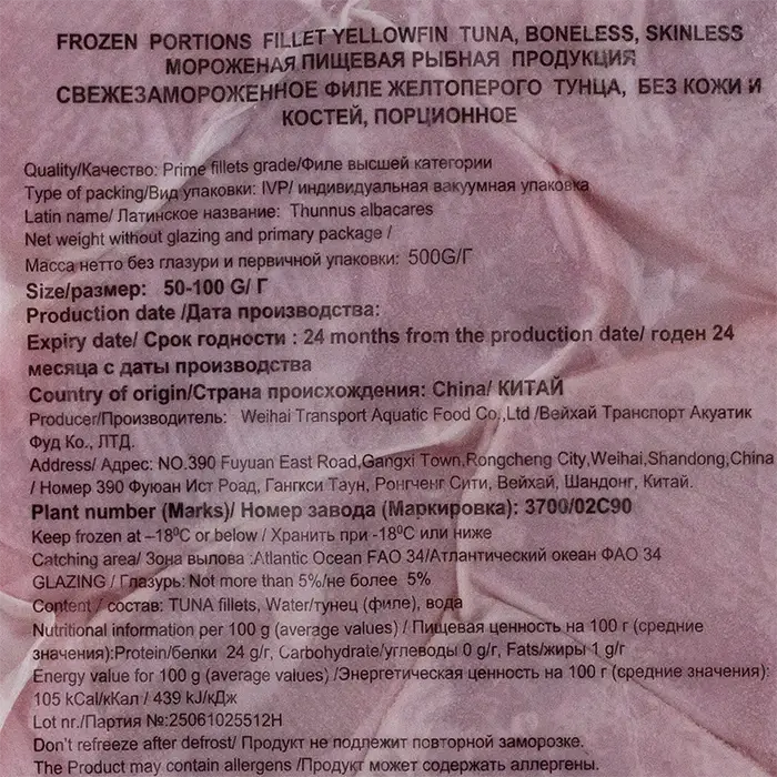 Филе тунца свежемороженое, кусочки 50–100 г, 500 г