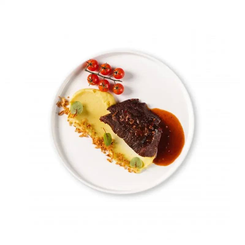 Блюдо из жилистой части мраморного быка породы Black Angus, мясо которого отличается сочностью, обильной мраморностью и тонкими жировыми прослойками.