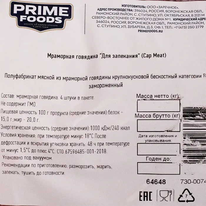 Говядина для запекания Cap Meat "ПРАЙМФУДС", 2-3 кг