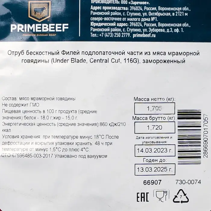 Говядина, филей подлопаточной части Under Blade Central Cut 116G «Праймбиф», 2–2,5 кг