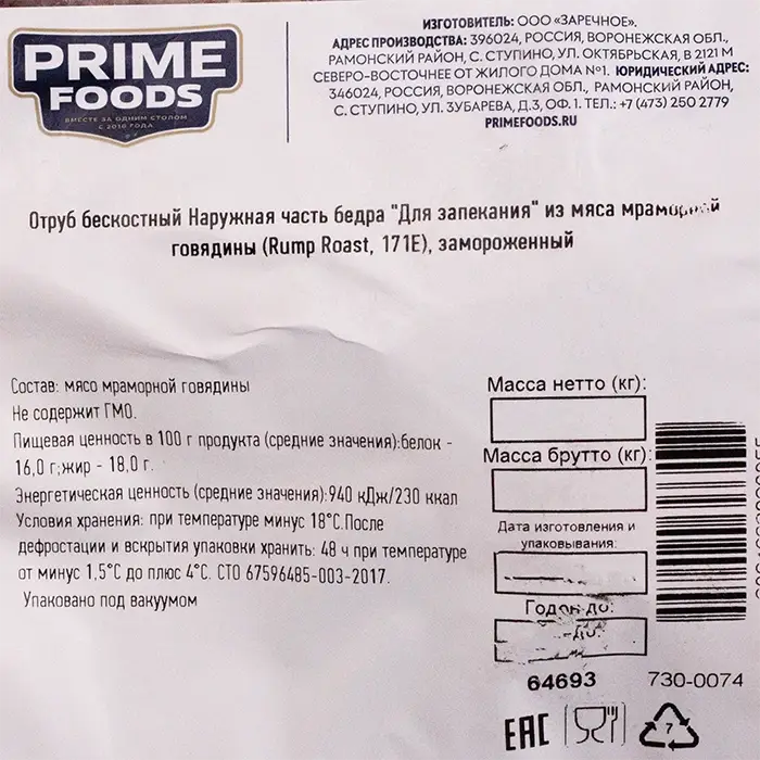 Говядина, наружная часть бедра для запекания Rump Rost 171 E "ПРАЙМФУДС", 2,5-3 кг