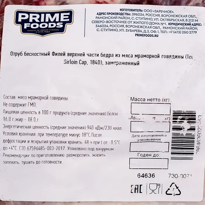 Говядина, пиканья, филей верхней части бедра Top Sirloin Cap 184 D «ПРАЙМФУДС», 1,2-3,8 кг