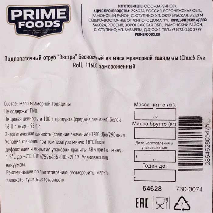 Говядина, подлопаточный отруб экстра Chuck Eye Roll 116 D "ПРАЙМФУДС", 4-6 кг