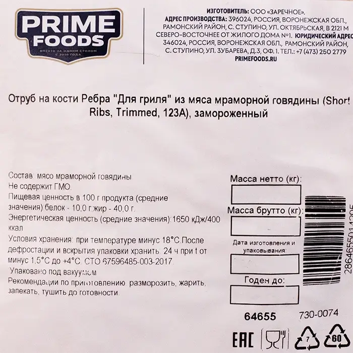 Говядина, ребра для гриля Short Ribs Trimmed 123 A "ПРАЙМФУДС", 1-1,8 кг